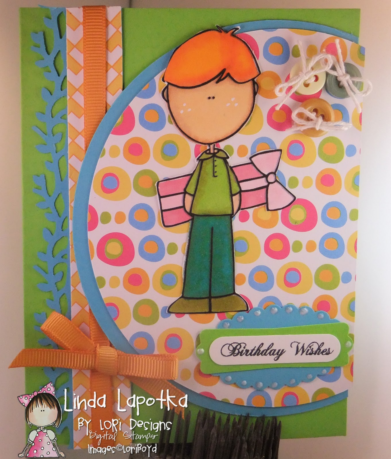 I did completed one card. This is Lollipop-Tanner from By LORi Design. I colored him a week ago and this is the first chance I had to make a card. I used the Sweet Sunday Sketch for the layout.